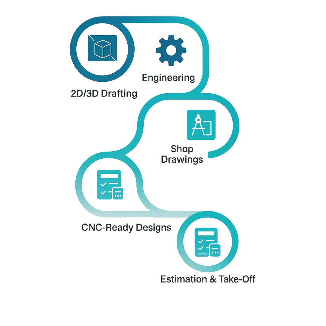 At FURNiGENCE LLP, we deliver complete solutions tailored for cabinetmakers and manufacturers. From precise Drafting and Engineering to detailed Shop Drawings and CNC-Ready Designs, our team ensures seamless production flow. We also provide accurate Estimation and Take-Off services to help you quote and plan with confidence.